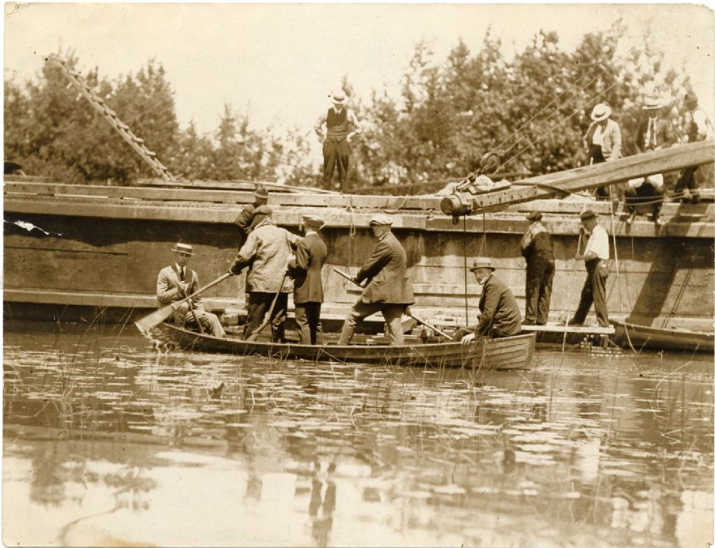 Hommes en canot devant un pont, [Vers 1920], Archives nationales à Québec, Collection Julienne Sioui, (03Q,P907,P29), Photographe non identifié.