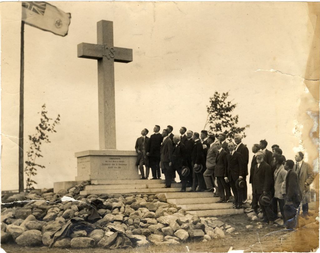 Rassemblement d’hommes au pied d’un monument commémoratif, [Vers 1920], Archives nationales à Québec, Collection Julienne Sioui, (03Q,P907,P56), Photographe non identifié.