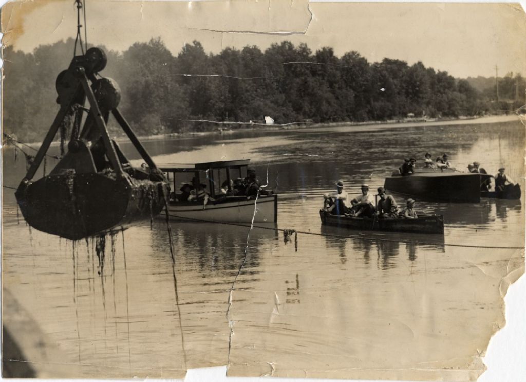 Personnes en canot regardant une grue fouiller le fond des eaux, [Vers 1920], Archives nationales à Québec, Collection Julienne Sioui, (03Q,P907,P70), Photographe non identifié.