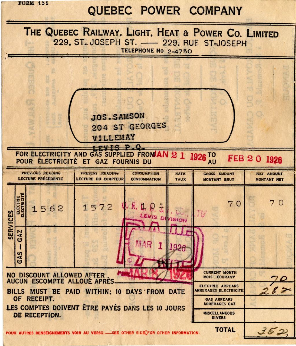 Facture au nom de Joseph Samson pour électricité et gaz, 1926, Archives nationales à Québec, Fonds Famille Gabriel Samson, (03Q,P923,D12,P9).