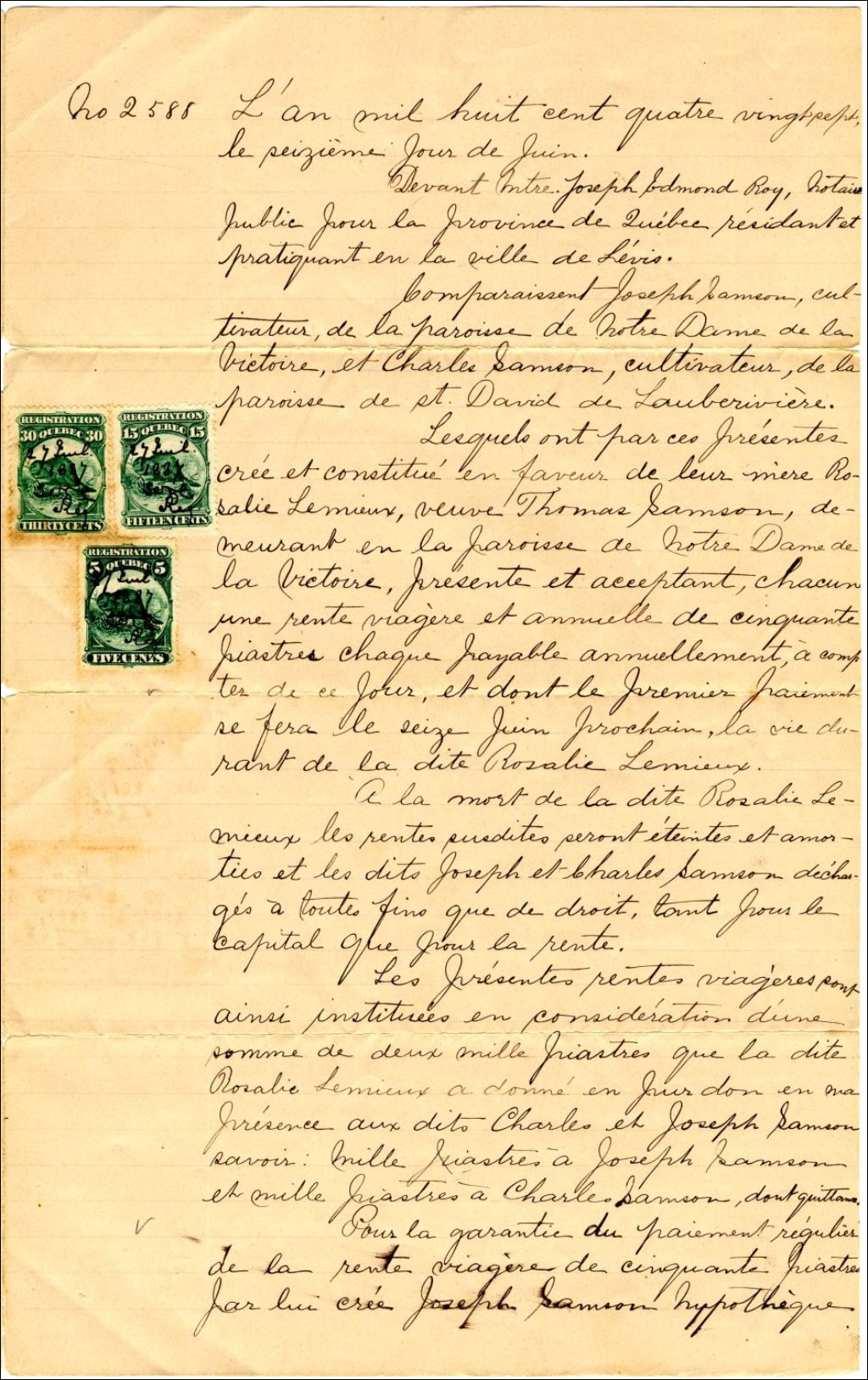 - Rente viagère par Joseph et Charles Samson à leur mère Rosalie Lemieux, veuve de Thomas Samson