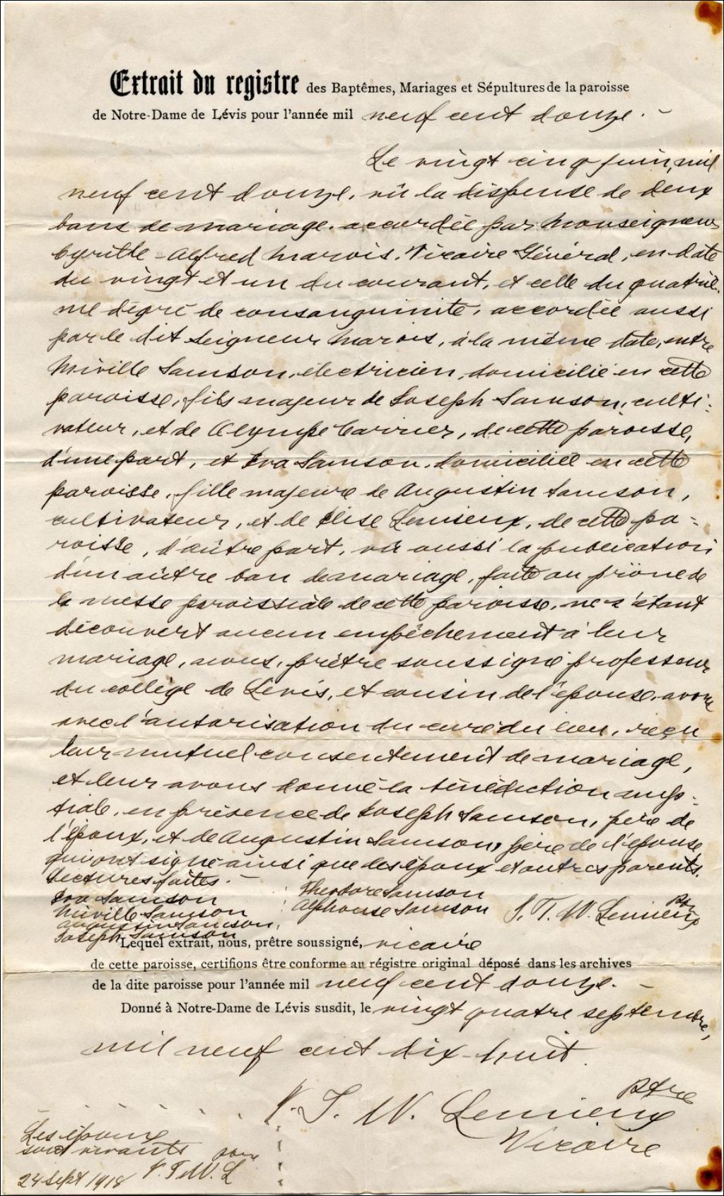 Extrait du registre du mariage de Miville Samson et de Eva Samson, 1912, Archives nationales à Québec, Fonds Famille Gabriel Samson, (03Q,P923,D3,P4).