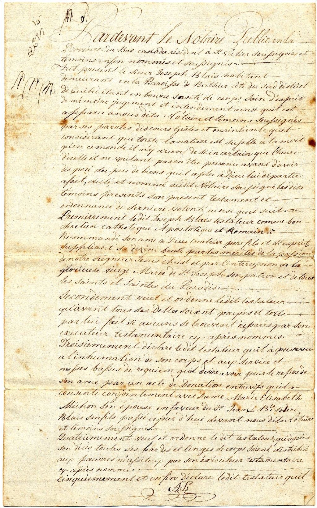 Testament et ordonnance des dernières volontés de Joseph Blais, devant le notaire Augustin Larue