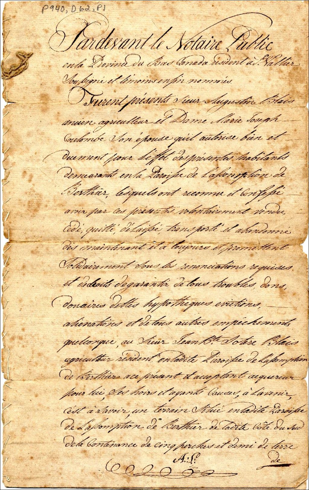 - Contrat de vente consenti par Augustin Blais et Marie Joseph Coulombe, son épouse à Jean Baptiste [Sotere] ou [Lotere] Blais, devant le notaire Augustin Larue
