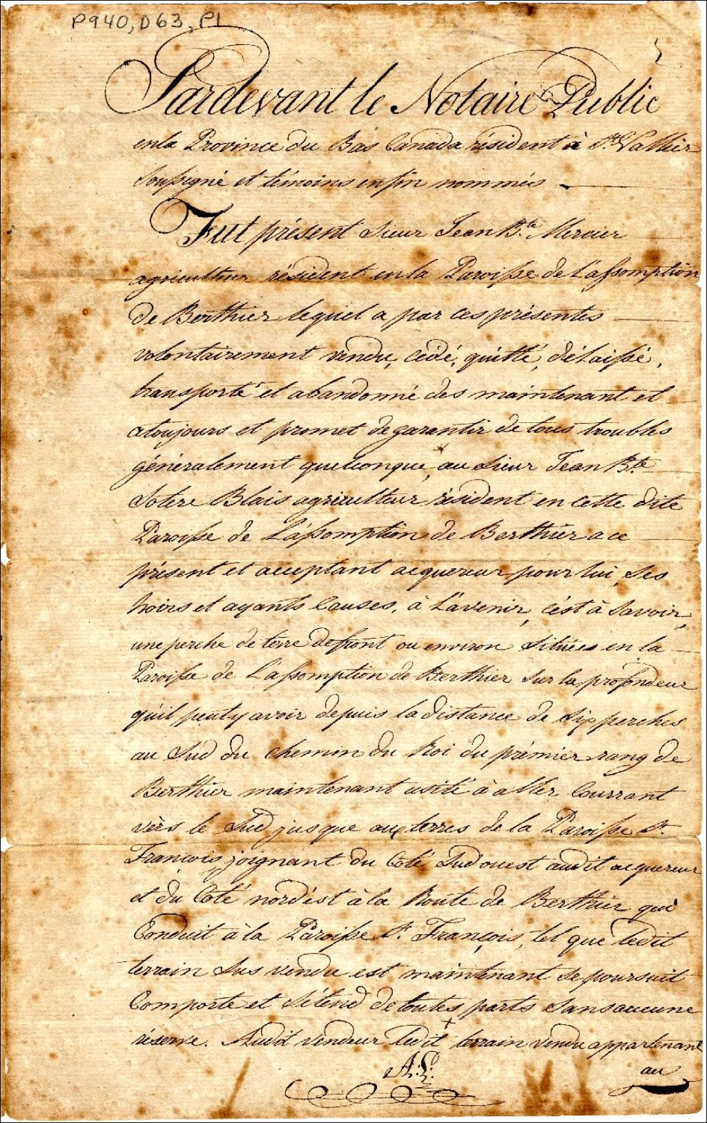 Vente consentie par Jean Baptiste Mercier à Jean Baptiste [Sotere] ou [Lotere] Blais, devant le notaire Augustin Larue, 8 mai 1818, Archives nationales à Québec, Fonds Famille Pierre Blais, (03Q,P940,D63).