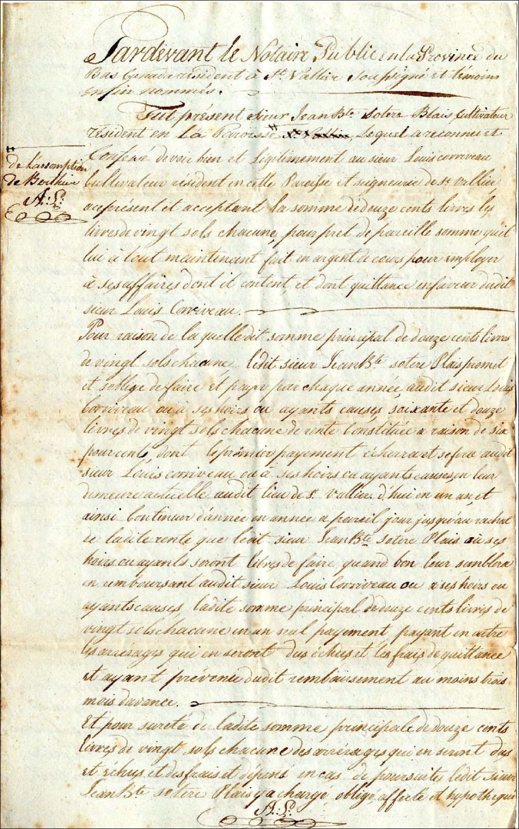 Constitution d'une rente consentie par Jean Baptiste [Sotere] ou [Lotere] Blais, en faveur de Louis Corriveau, devant le notaire Augustin Larue