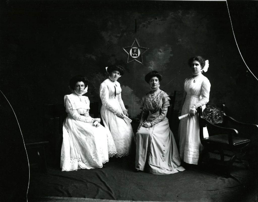 Le négatif représente trois étudiantes et leur professeur. Il s'agit vraisemblablement d'étudiantes en musique, peut-être de Villa maria