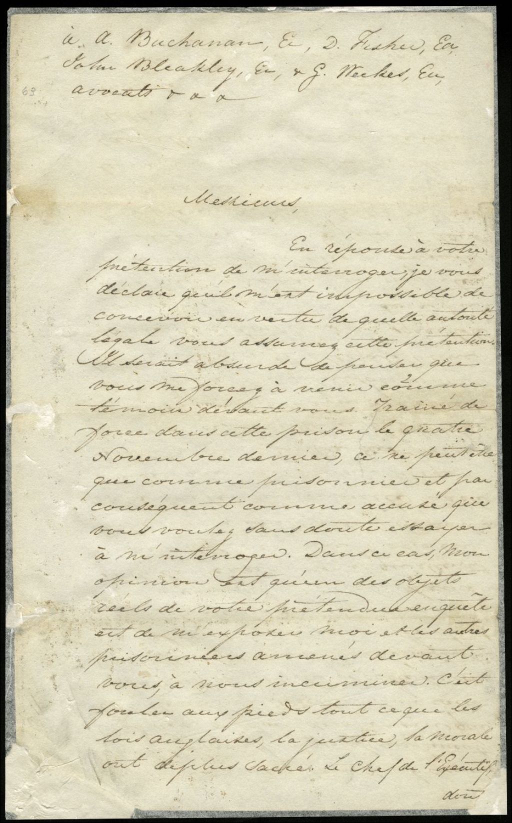 Lettre de L. H. Lafontaine, prisonnier à Montréal, aux commissaires Buchanan, Fisher, Blackley et Weekes, 10 décembre 1838, Archives nationales à Montréal, Collection rébellion de 1837-1838, (06M,P224,S1,P63).