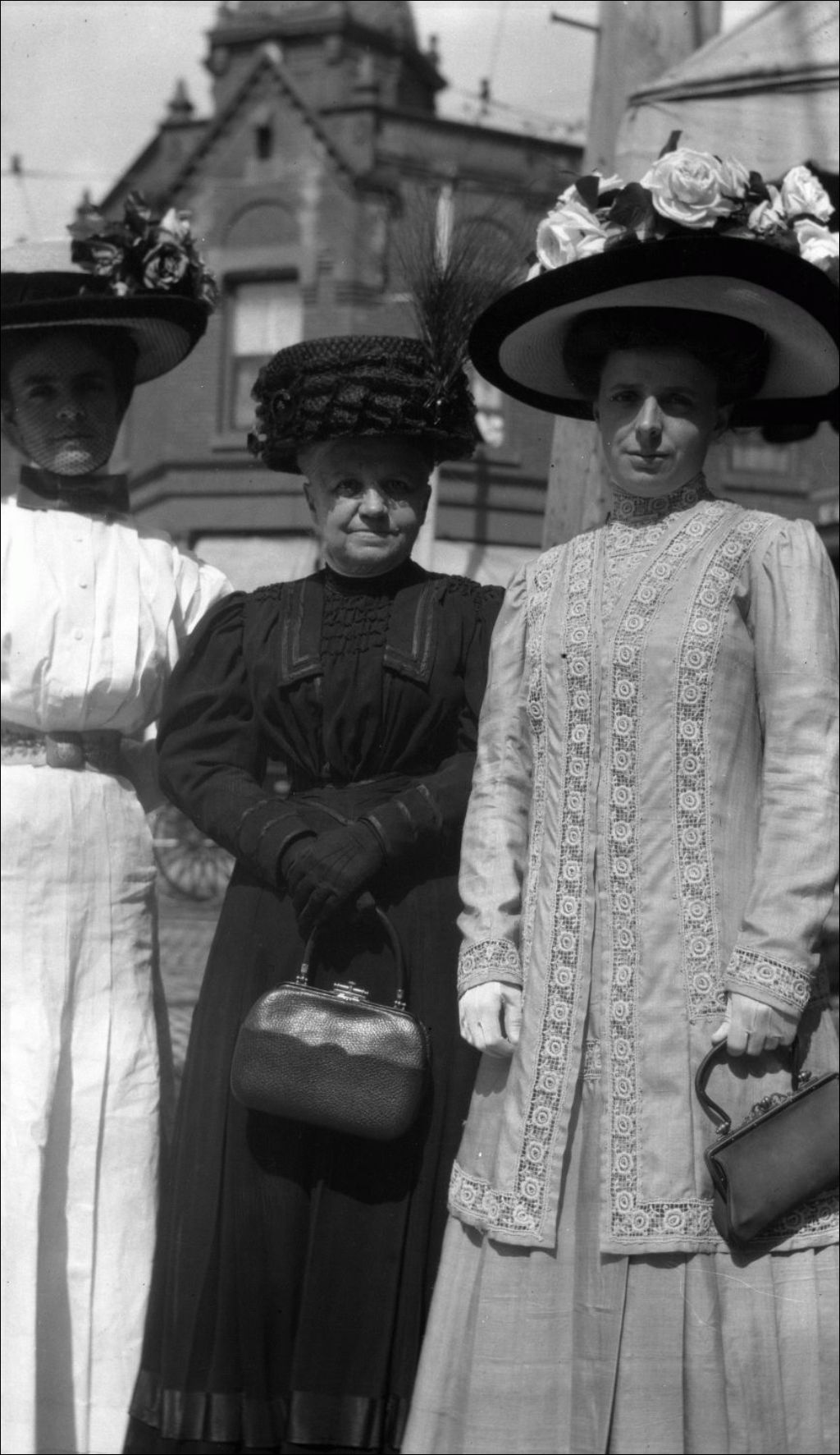 [Marguerite Hudon, Eugénie Chaput et Gertrude Hudon] en robes longues, chapeaux et sacs à main