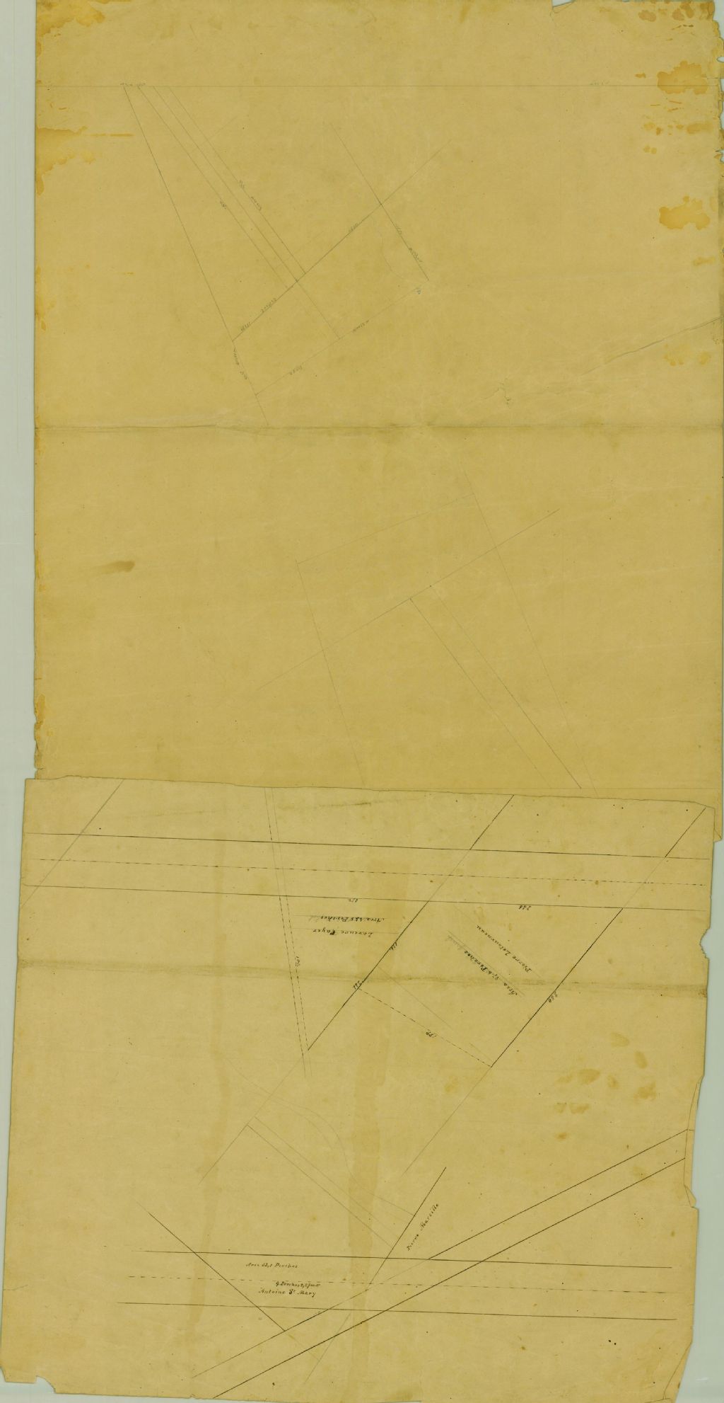 Plan d'arpentage de terrains appartenant à Pierre Létourneau, la veuve Cayer, Pierre Marcille, Antoine Sainte-Marie, Charles Lemieux et Joseph Giroux situés probablement en Montérégie