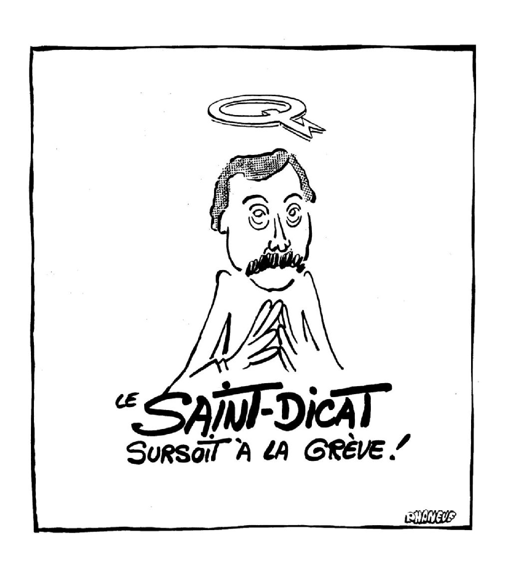 Un personnage est entouré d'une auréole représentant la lettre "Q" de Hydro-Québec. Au bas de la page, l'inscription suivante est inscrite : "Le Saint-Dicat, sursoit à la grève!"