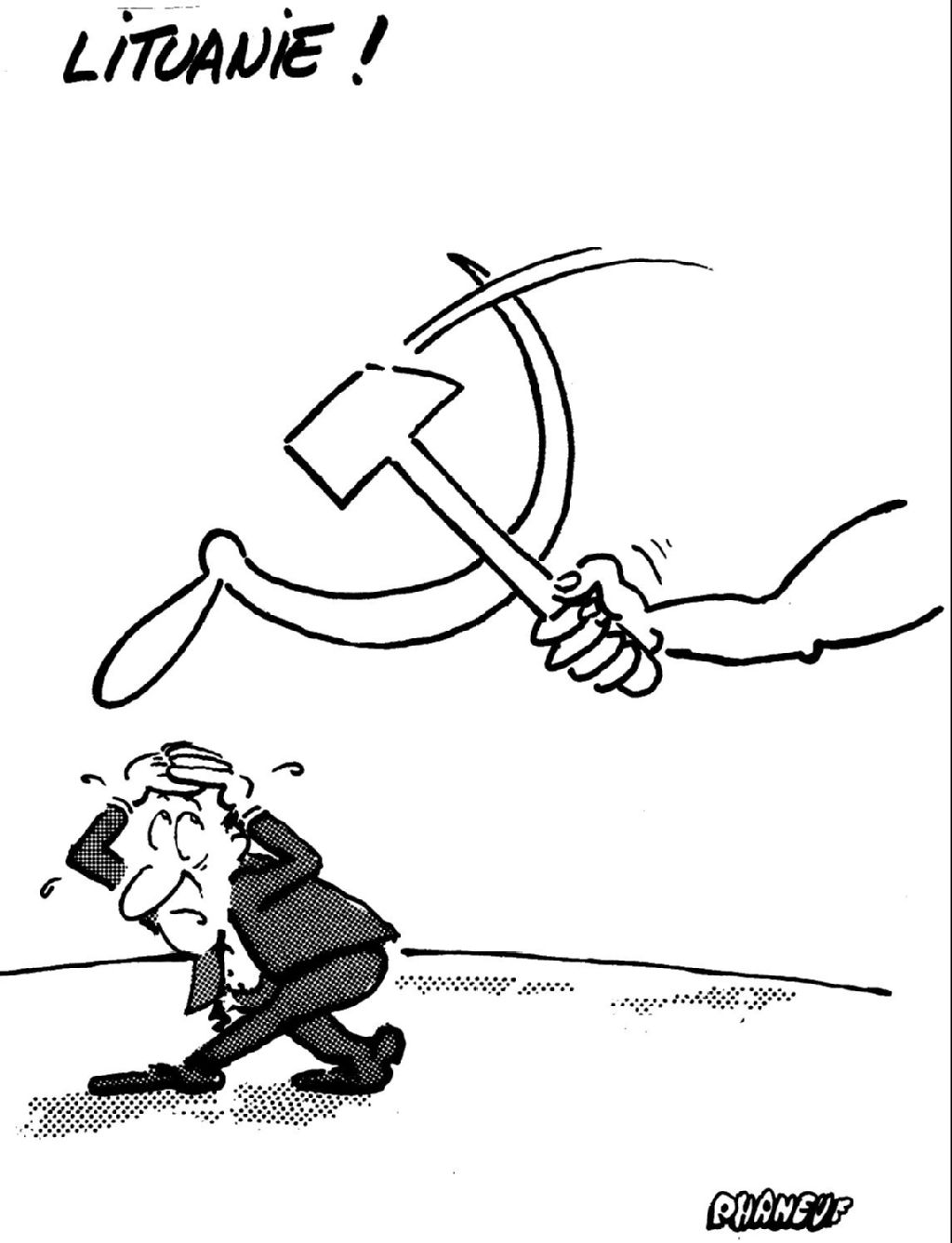 Un personnage frappe un citoyen de Lituanie avec le symbole du socialisme