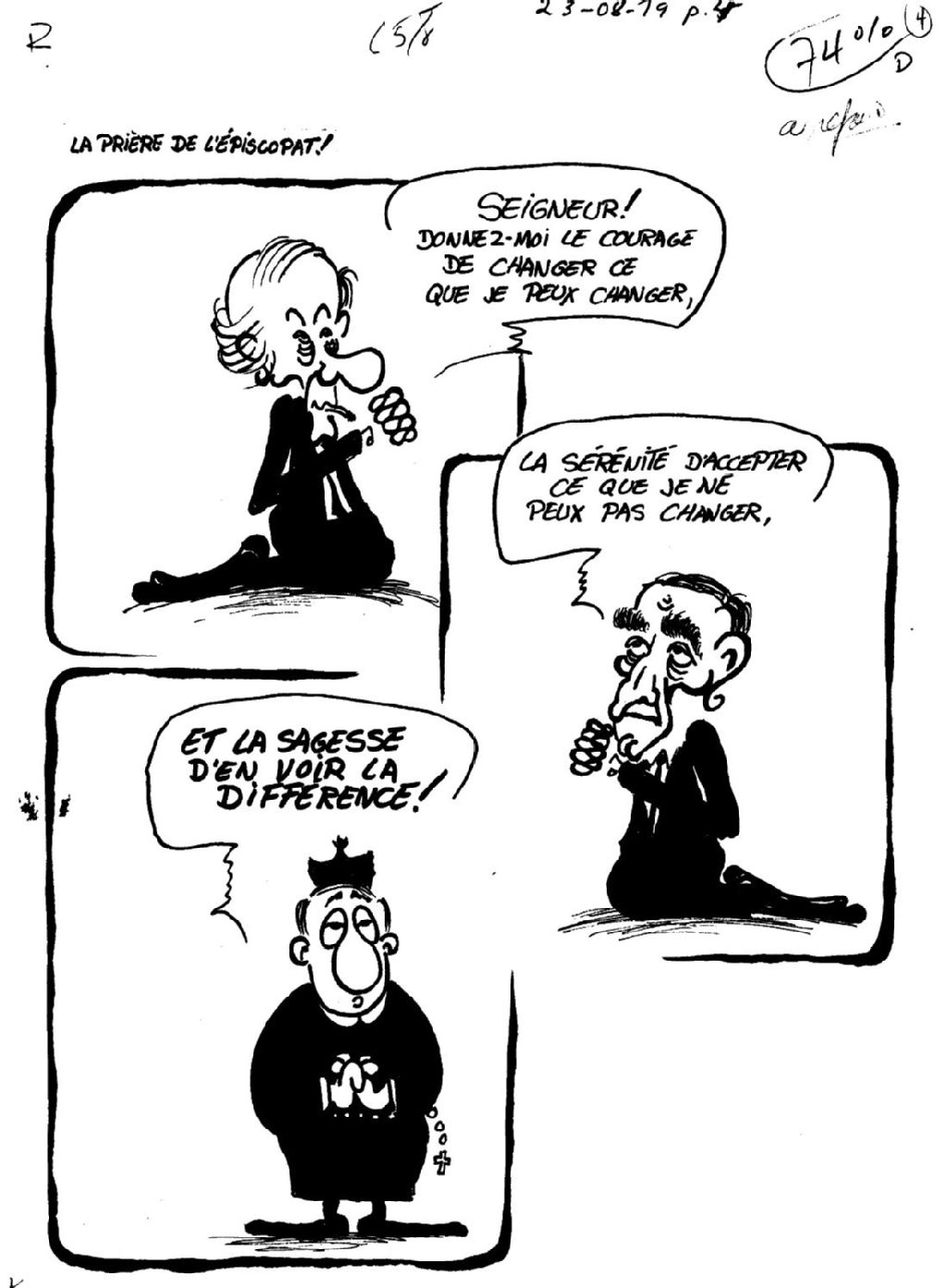 René Lévesque, Claude Ryan et un prêtre font chacun une prière. René Lévesque dit : " Seigneur! Donnez-moi le courage de changer ce que je peux changer." Claude Ryan dit : " La sérénité d'accepter ce que je ne peux pas changer." Le prêtre, quant à lui, dit : "Et la sagesse d'en voir la différence!"