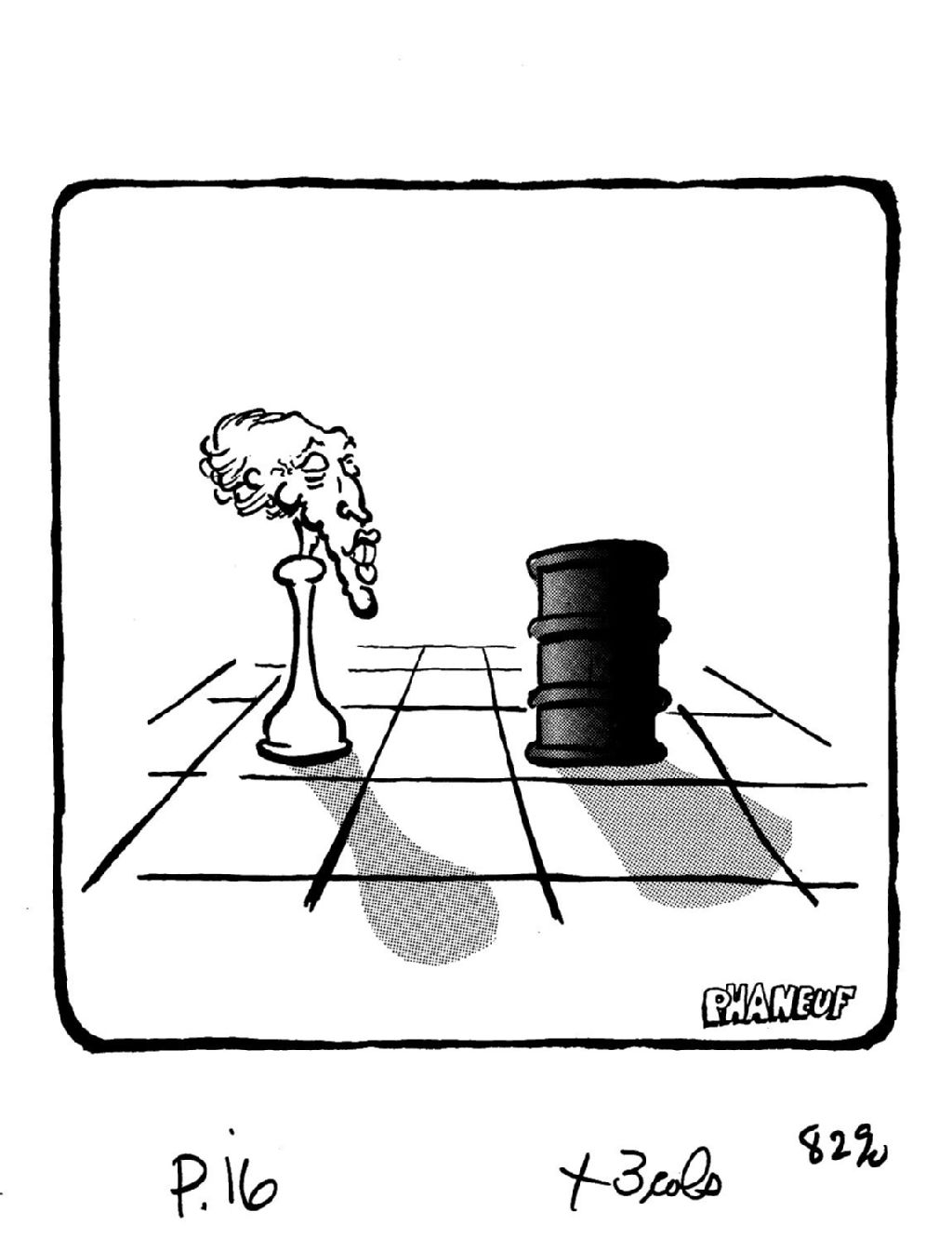 Sur un jeu d'échec, Pierre Elliott Trudeau déguisé en pion fait face à un baril de pétrole