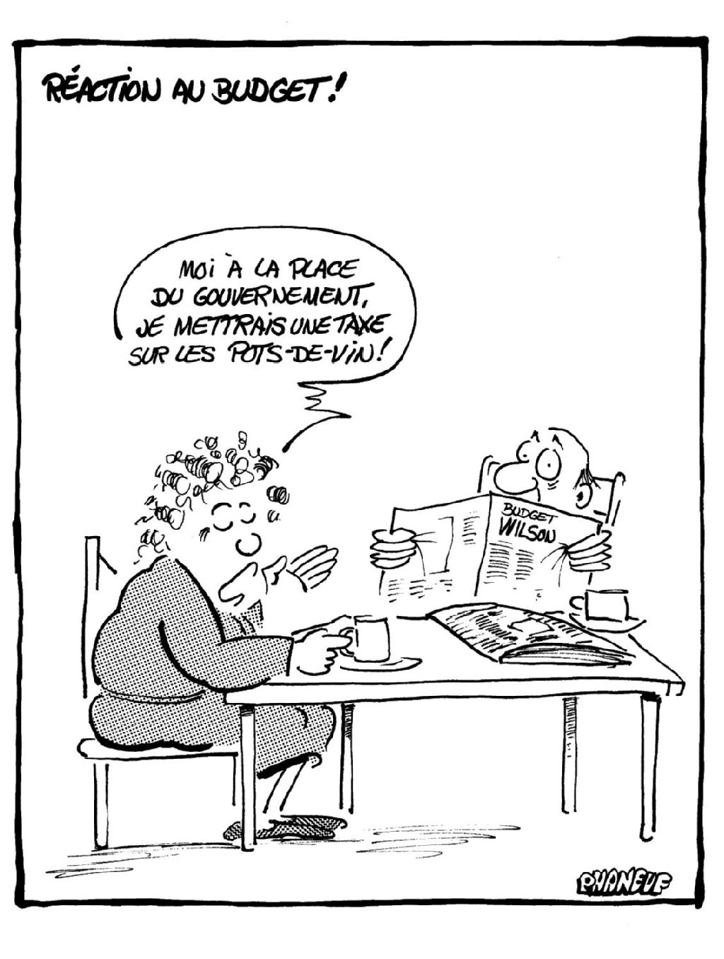 Réaction au budget, 20 février 1987, Archives nationales à Montréal, Fonds Jean-Marc Phaneuf, (06M,P575,S4,SS4,P300), Jean-Marc Phaneuf.