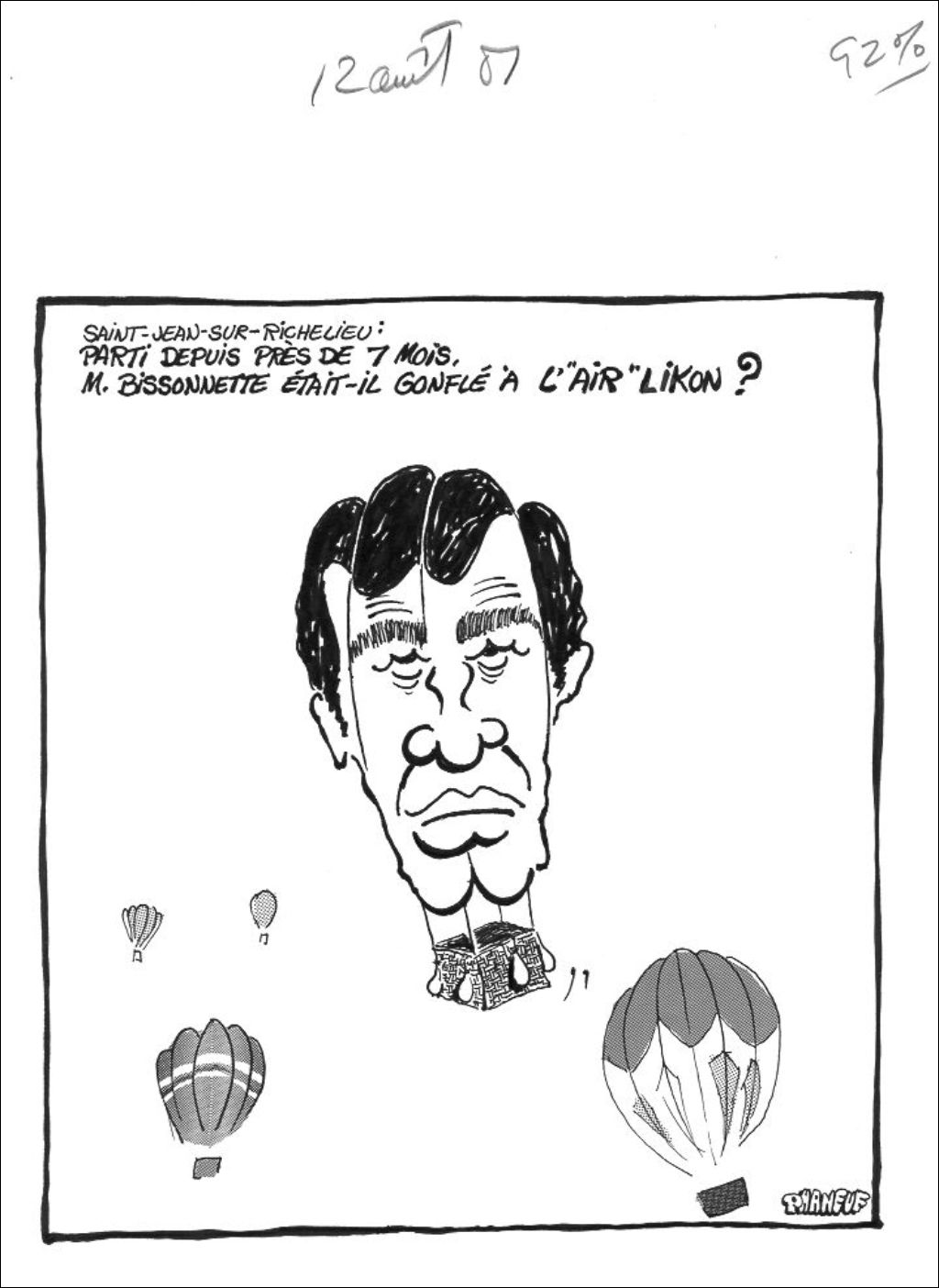 Saint-Jean-sur-Richelieu : parti depuis près de 7 mois, M. Bissonnette était-il gonflé à l'air likon, 12 août 1987, Archives nationales à Montréal, Fonds Jean-Marc Phaneuf, (06M,P575,S4,SS4,P362), Jean-Marc Phaneuf.