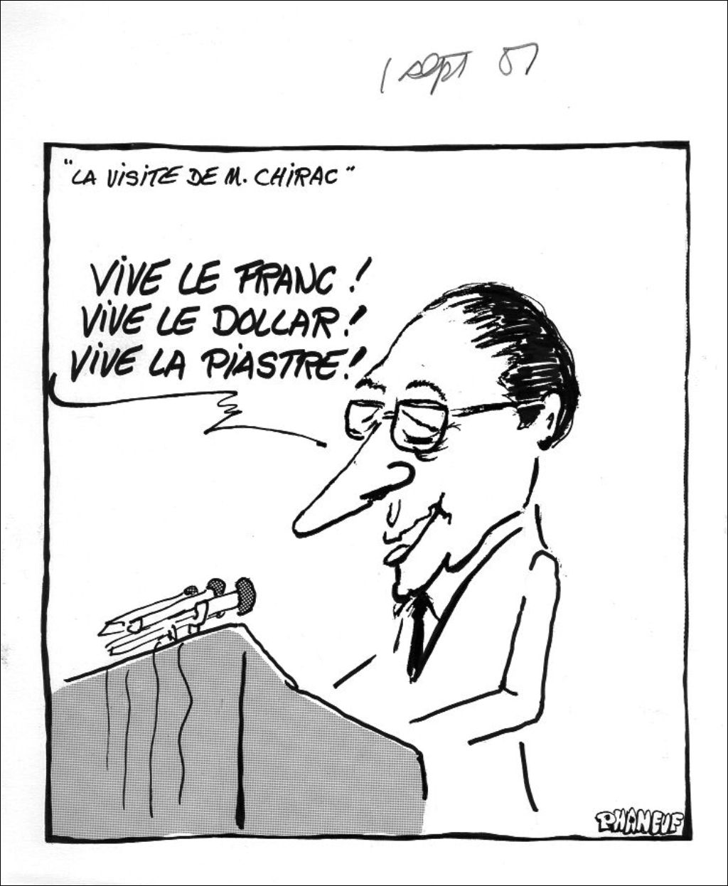 Jacques Chirac dit : "Vive le franc! Vive le dollar! Vive la piastre!"