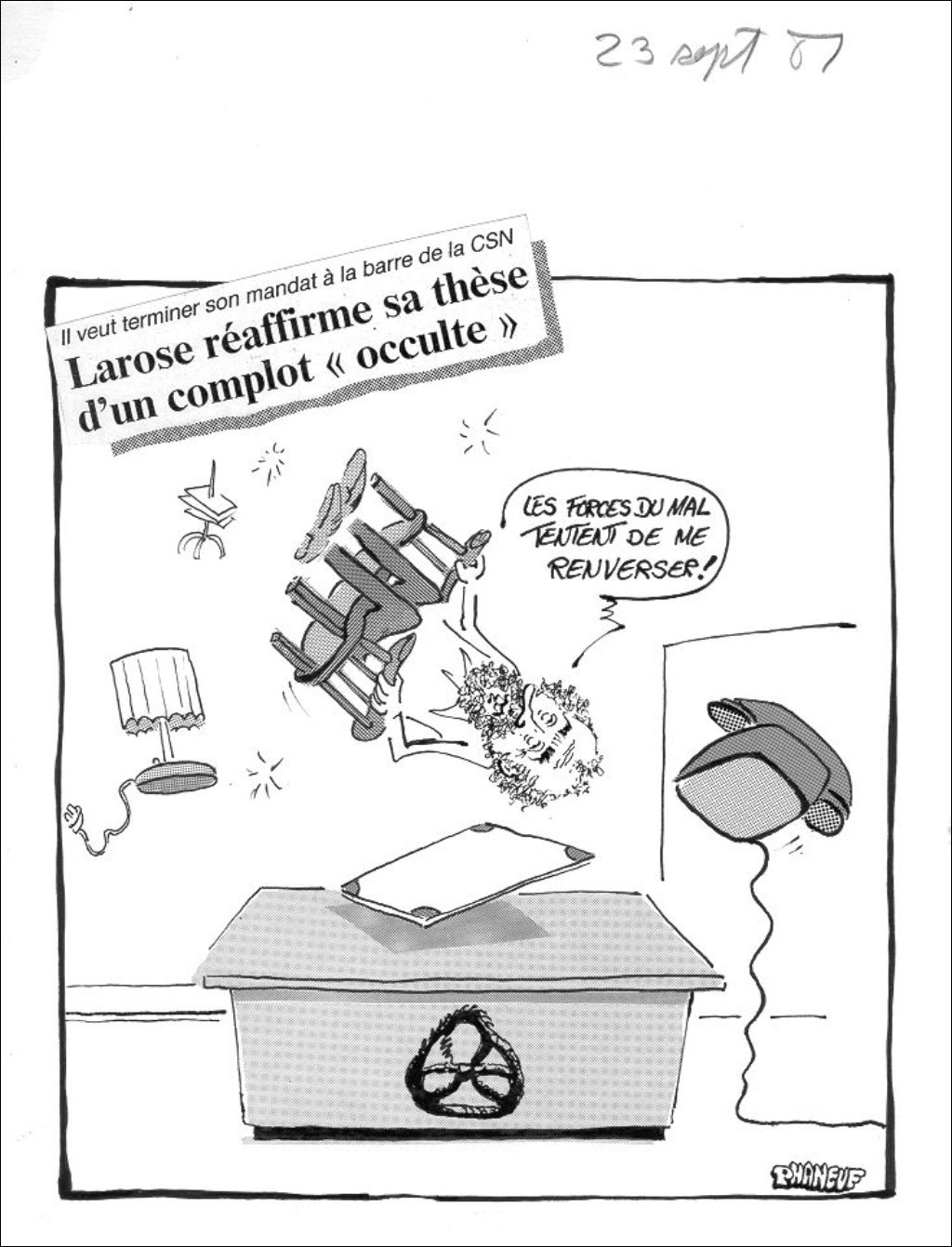 Il veut terminer son mandat à la barre de la CSN. Larose réaffirme sa thèse d'un complot occulte, 23 septembre 1987, Archives nationales à Montréal, Fonds Jean-Marc Phaneuf, (06M,P575,S4,SS4,P380), Jean-Marc Phaneuf.
