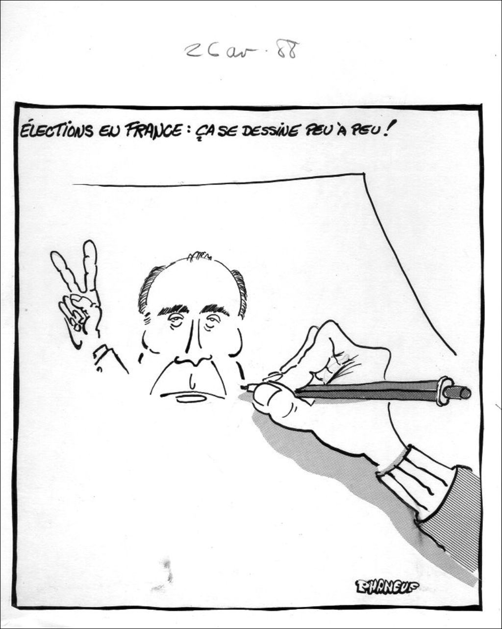 Élections en France : ça se dessine peu à peu, 26 avril 1988, Archives nationales à Montréal, Fonds Jean-Marc Phaneuf, (06M,P575,S4,SS4,P488), Jean-Marc Phaneuf.