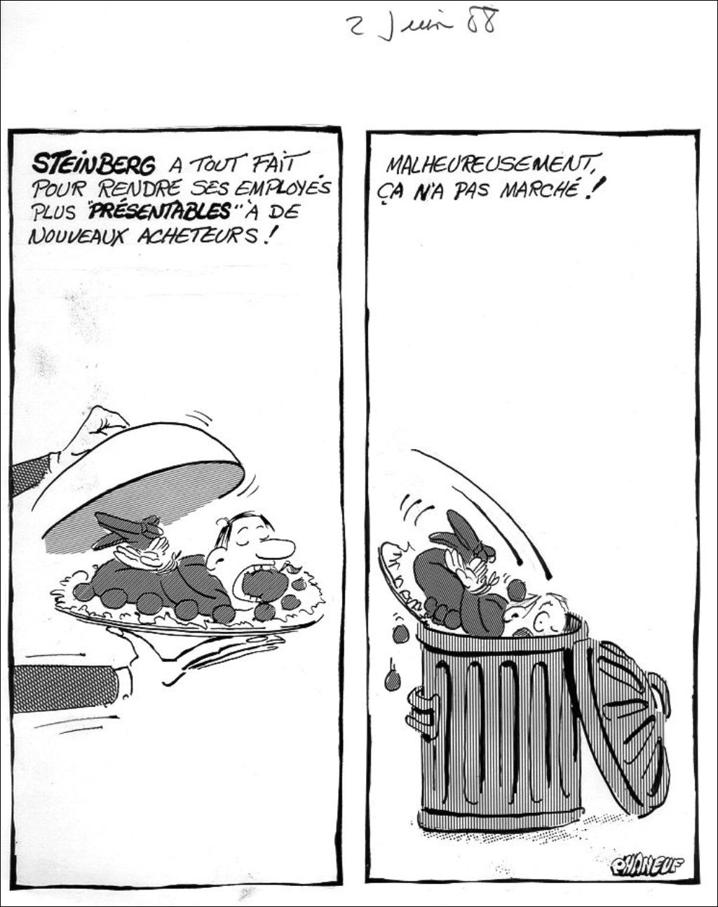 Dans la première partie de la caricature, un homme est servi sur un plateau. Il est écrit : "Steinberg a tout fait pour rendre ses employés plus "présentables" à de nouveaux acheteurs!" Dans la seconde partie, l'homme se retrouve à la poubelle et il est écrit : "Malheureusement, ça n'a pas marché!"