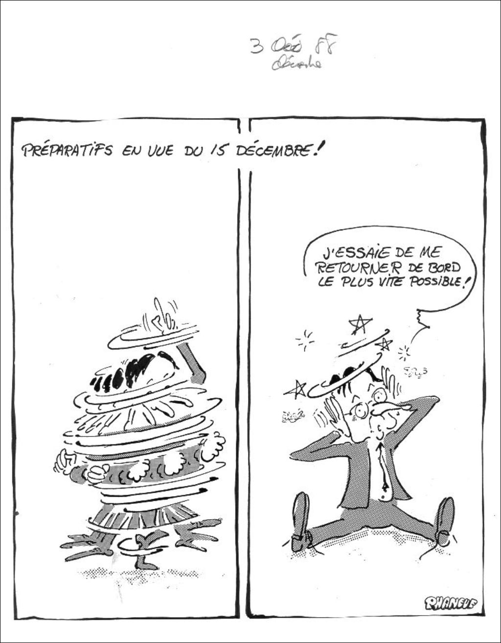 Dans la première partie de la caricature, Robert Bourassa tourne sur lui-même très rapidement. Dans la seconde partie, il est assis par terre, étourdit et dit : "J'essaie de me retourner de bord le plus vite possible!"