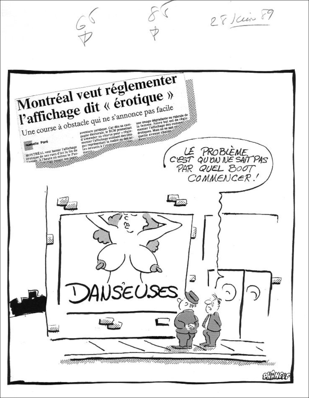 Montréal veut réglementer l'affichage dit «érotique», 28 juin 1989, Archives nationales à Montréal, Fonds Jean-Marc Phaneuf, (06M,P575,S4,SS4,P671), Jean-Marc Phaneuf.