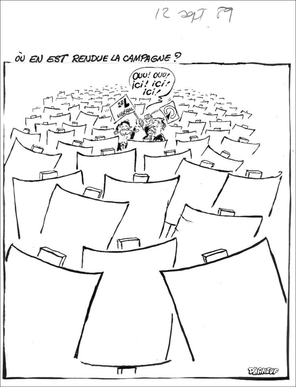Jacques Parizeau, tenant le logo du Parti Québécois, et Robert Bourassa, avec le logo du Parti Libéral, répondent au titre de la caricature en criant : "Ouu! Ouu! Ici! Ici! Ici!". Ils sont tous les deux perdus au milieu d'une foule de pancartes