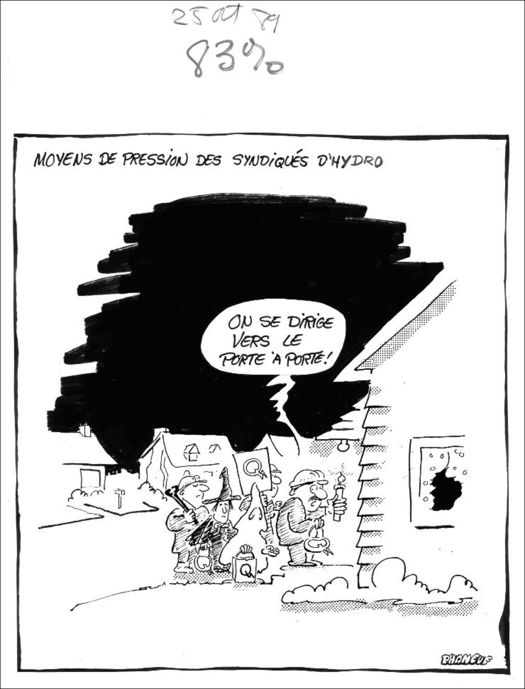 Déguisés, des syndiqués d'Hydro-Québec font du vandalisme sur les installations électriques d'un particulier en guise de moyen de pression. L'un d'eux dit : "On se dirige vers le porte à porte!". Nous voyons le logo d'Hydro-Québec