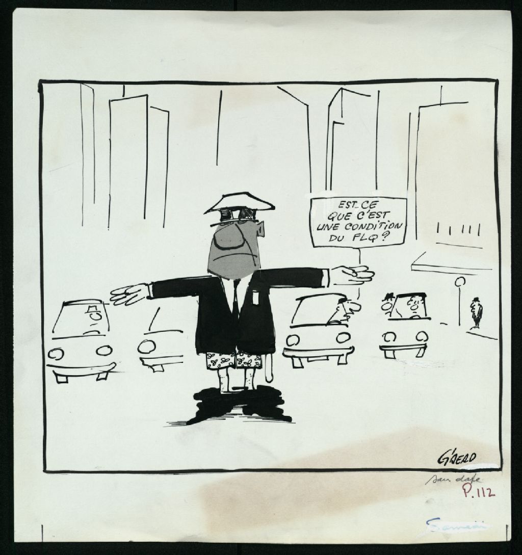 Les culottes baissées, un policier fait la circulation routière, [197-], Archives nationales à Montréal, Fonds Jean-Pierre Girerd, (06M,P683,S2,SS2,P26), Girerd.