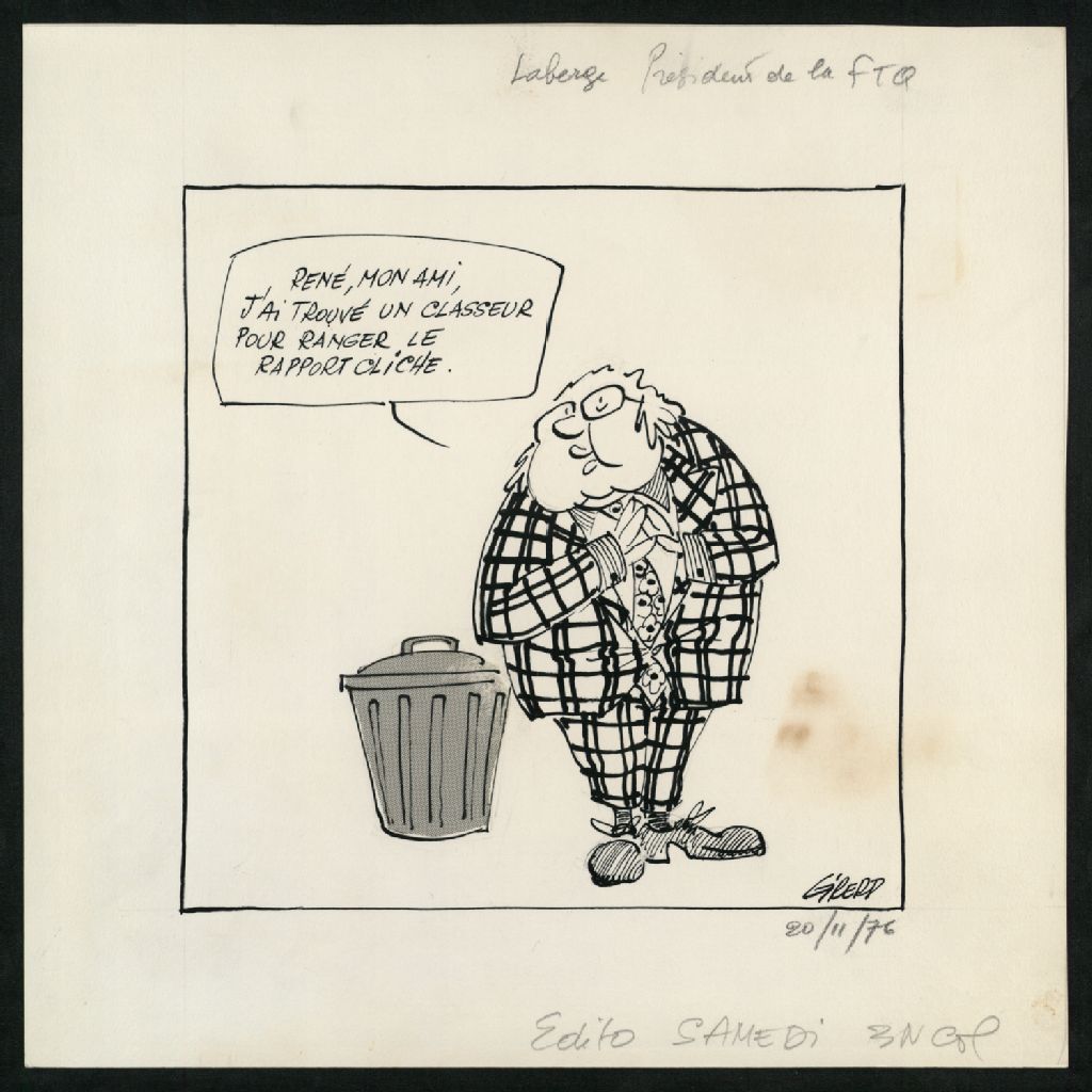 Une poubelle pour le rapport Cliche, 20 novembre 1976, Archives nationales à Montréal, Fonds Jean-Pierre Girerd, (06M,P683,S2,SS2,P332), Girerd.