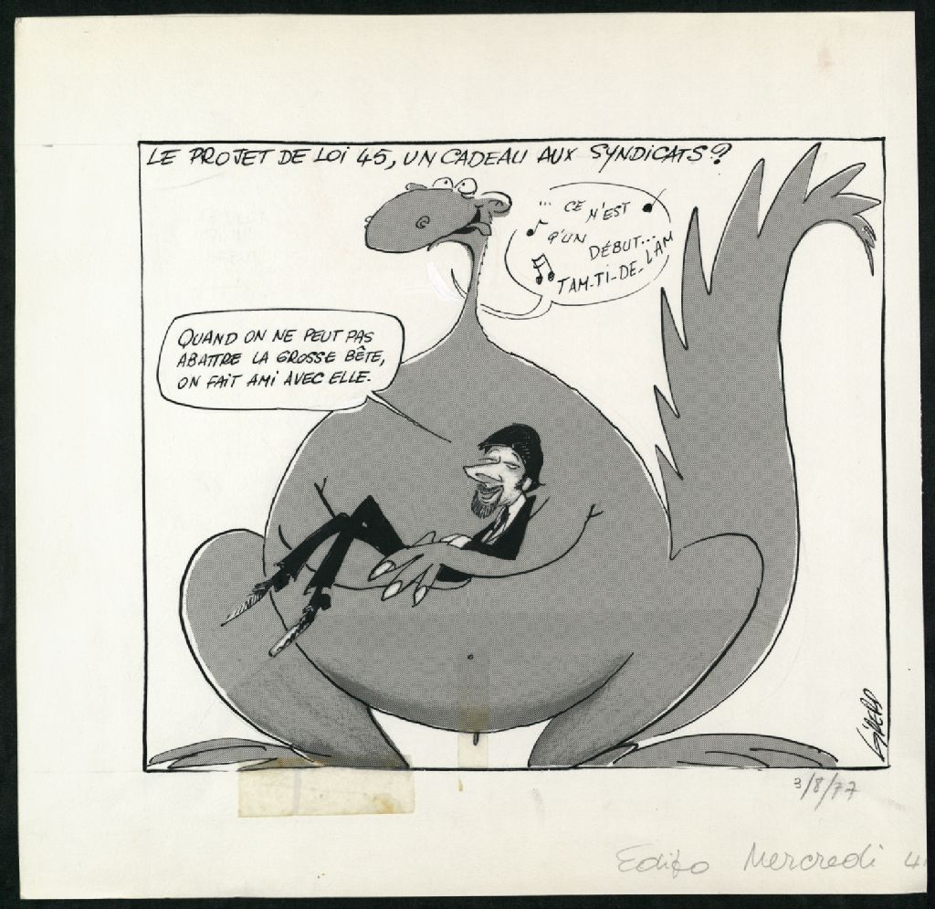 Le projet de loi 45, un cadeau aux syndicats, 3 août 1977, Archives nationales à Montréal, Fonds Jean-Pierre Girerd, (06M,P683,S2,SS2,P372), Girerd.