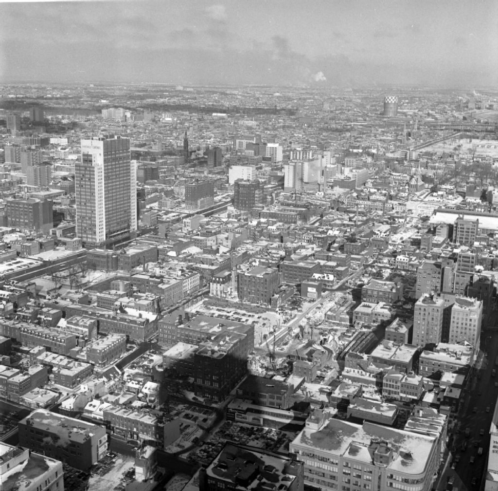 - Vues du centre-ville et du port de Montréal réalisées à partir du toit de la tour de la Bourse