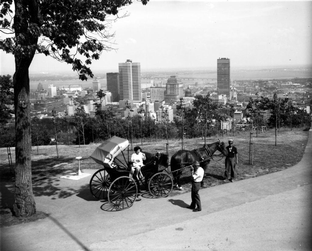 - Ce dossier témoigne des activités touristiques se déroulant au chalet du parc du Mont-Royal. Il contient deux vues de touristes en calèche avec en arrière-plan le centre-ville de Montréal