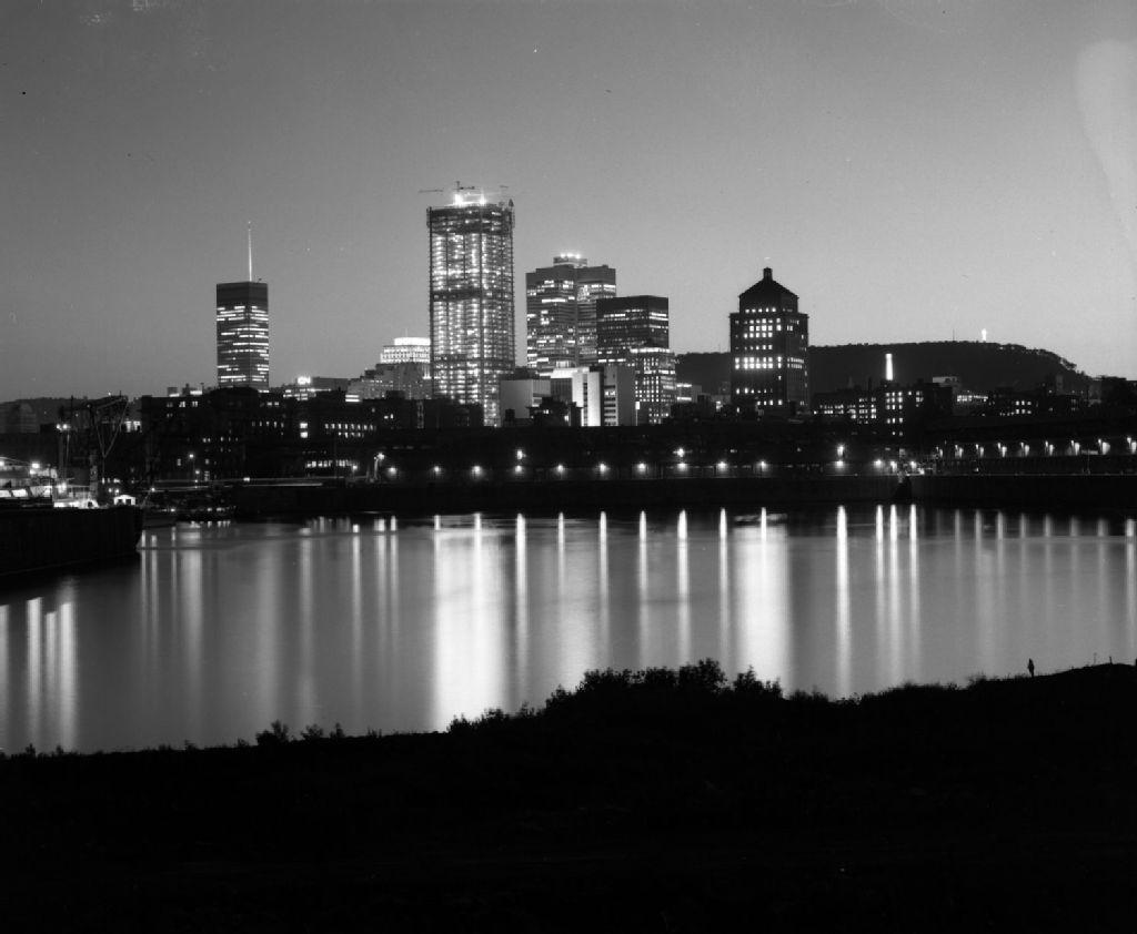 La tour de la place Victoria devenue la tour de la Bourse, le soir, vue du port de Montréal, 31 juillet 1964, Archives nationales à Montréal, Fonds Henri Rémillard, (06M,P685,S2,D82), Henri Rémillard.