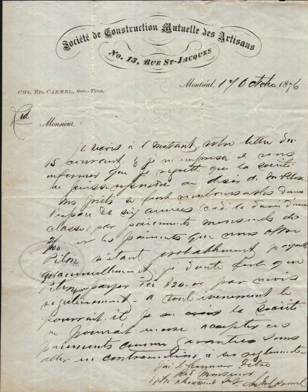 Lettre de Chs. Ed. Carmel, de la Société de Construction Mutuelle des Artisans, au révérend Antoine Labelle