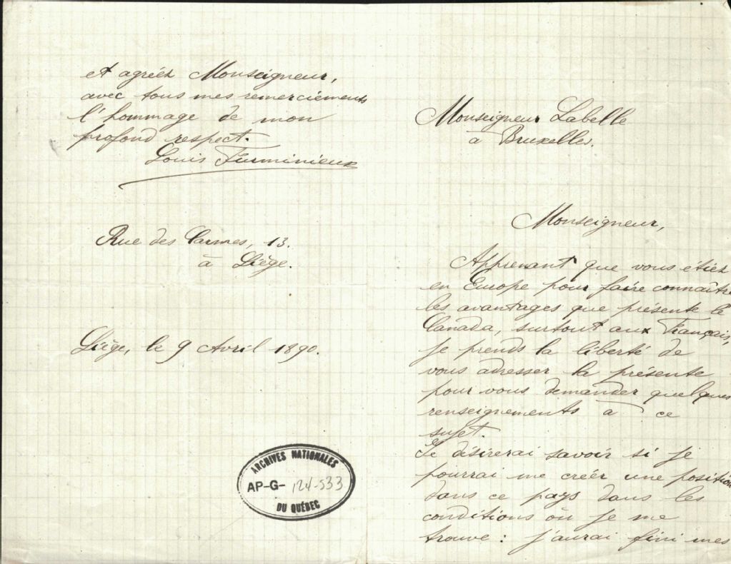 Lettre de Louis Ferminieux à monseigneur Antoine Labelle, 9 avril 1890, Archives nationales à Montréal, Fonds Antoine Labelle, (06M,P774,S1,D235).
