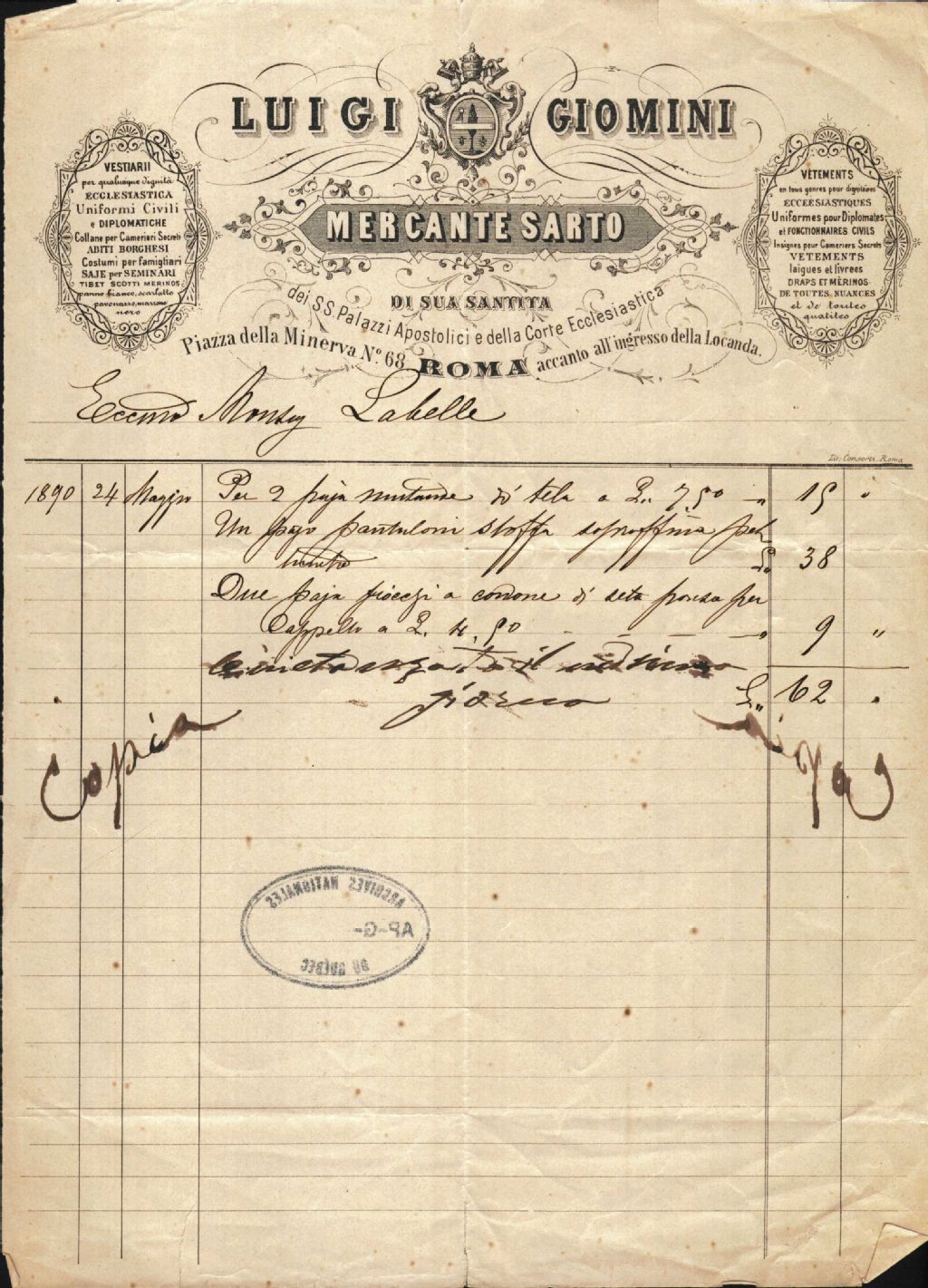 Lettre [facture] de Luigi Giomini à monseigneur Antoine Labelle