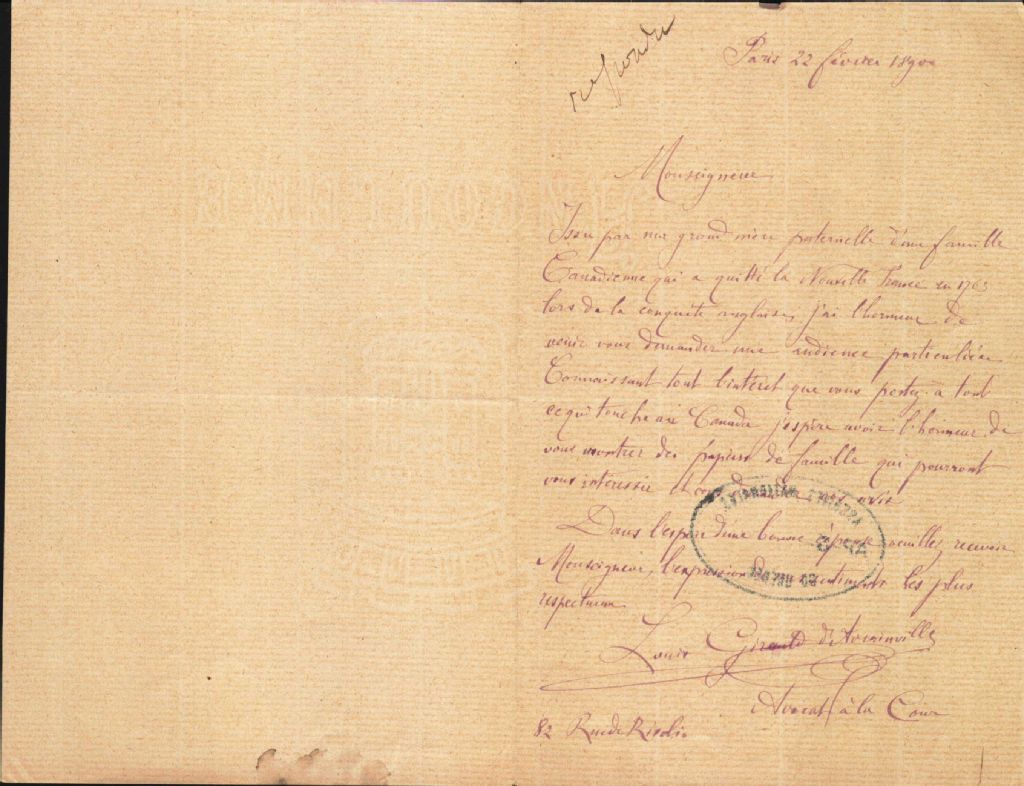 Lettre de Louis Girante d'Avirinville à monseigneur Antoine Labelle