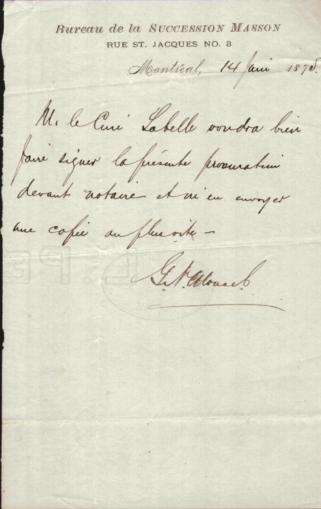 Lettre du Bureau de la Succession Masson au révérend Antoine Labelle, 14 janvier 1875, Archives nationales à Montréal, Fonds Antoine Labelle, (06M,P774,S1,D89).