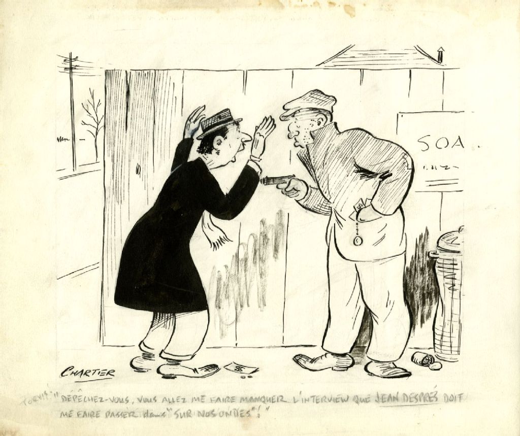 "Torvis! Dépêchez-vous, vous allez me faire manquer l'interview que Jean Despréz doit me faire passer dans "Sur nos ondes"!", [194-], Archives nationales à Montréal, Fonds Albert Chartier, (06M,P790,S1,P45), Chartier.