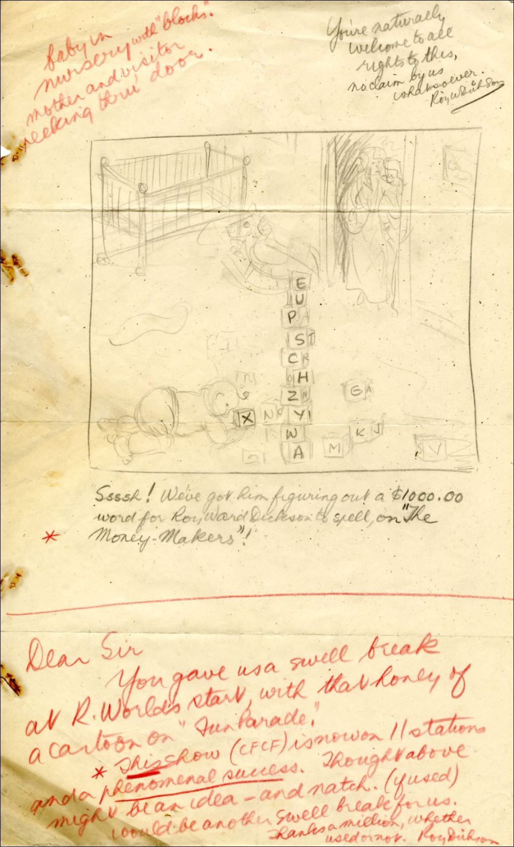 Le dessin montre un bébé jouant dans sa chambre avec des blocs. Deux femmes se tiennent dans l'embrasure de la porte dont une explique "Ssssh! We've got him figuring out a $1000.00 word for Roy Ward Dickson to spell on The Money-Makers!" La page comporte d'autres transcriptions manuscrites