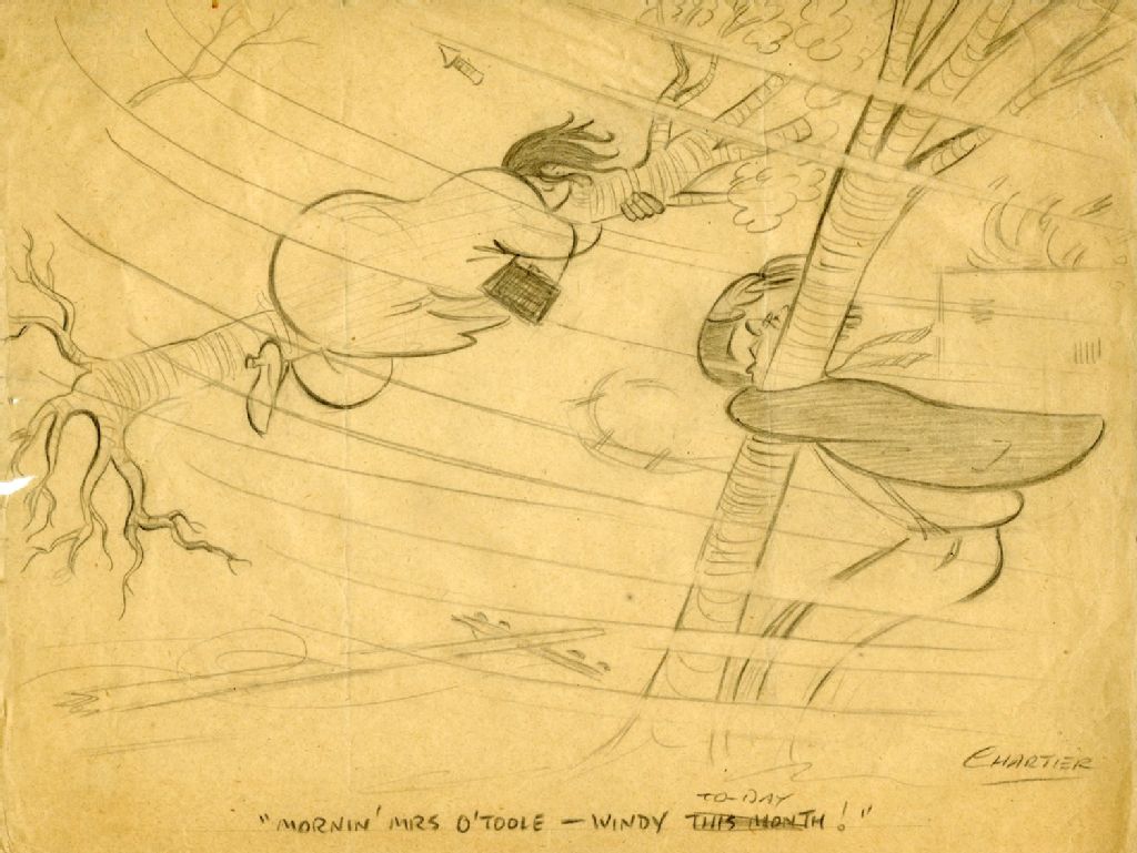 Le dessin montre une femme cramponnée à un arbre que le vent violent emporte et qui croise un homme se retenant à un arbre encore debout. L'homme dit à la femme "Mornin' Mrs O'Toole. Windy to-day!"