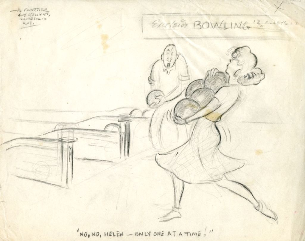 Le dessin montre une femme portant plusieurs boules de quilles et un homme lui disant "No, no, Helen. Only one at a time!"