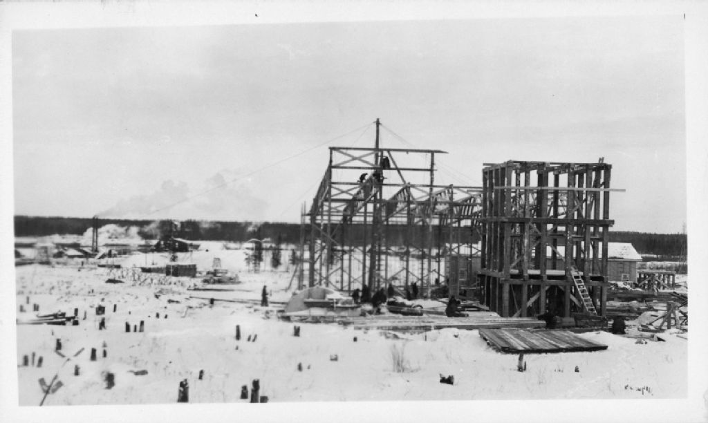 Canadian Malartic - Plan moyen de l'avant-plan des échafaudages de la mine., 1935-01-14, Archives nationales à Rouyn-Noranda, Fonds Ministère des Ressources naturelles, (08Y,E20,S2,SS1,P159), Photographe non identifié.