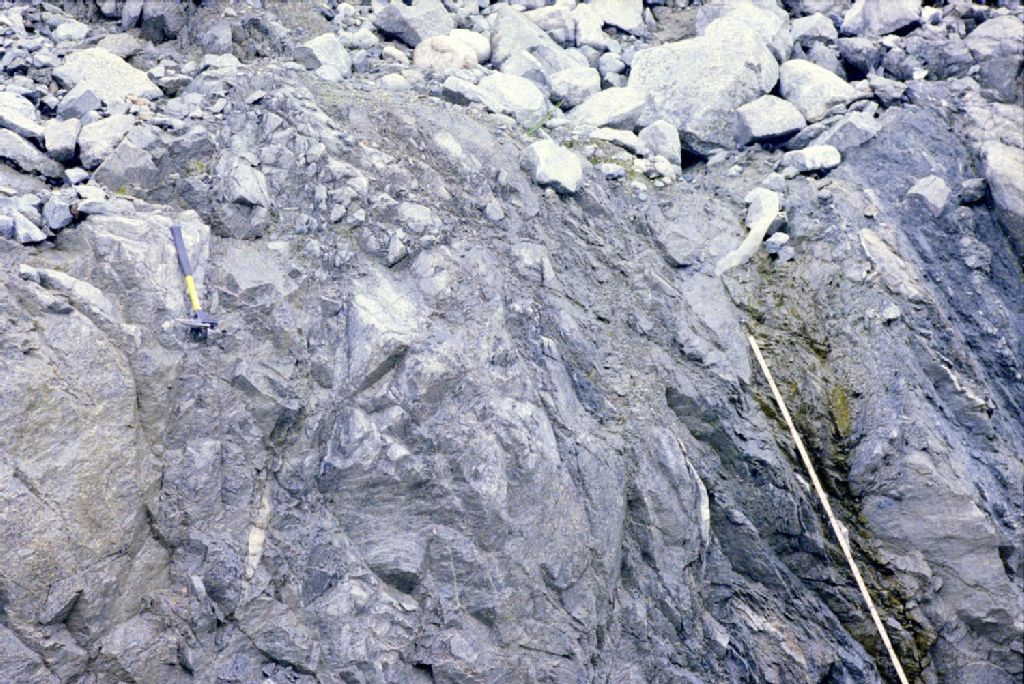 Tragédie Belmoral - Détails géologiques et géomécaniques - Granodiorite fracturée et cisaillée dans une direction E-O.., 1981-09-15, Archives nationales à Rouyn-Noranda, Fonds Ministère des Ressources naturelles, (08Y,E20,S2,SS1,P755), Photographe non identifié.