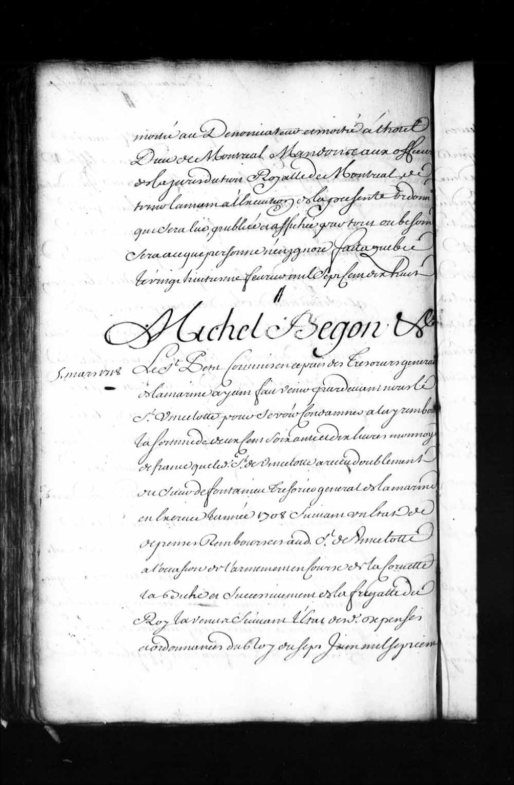Ordonnance de l'intendant Bégon qui condamne le sieur de Vincelotte (Amiot de Vincelot) à payer au sieur Petit, trésorier de la Marine, la somme de 270 livres, monnaie de France, en cartes ayant cours en ce pays, somme qu'il a reçue de trop en 1708, à l'occasion de l'armement en course de la corvette "la Biche" et successivement de la frégate du Roi "la Vénus", 5 mars 1718, Archives nationales à Québec, Fonds Intendants, (03Q,E1,S1,D6,P1105).