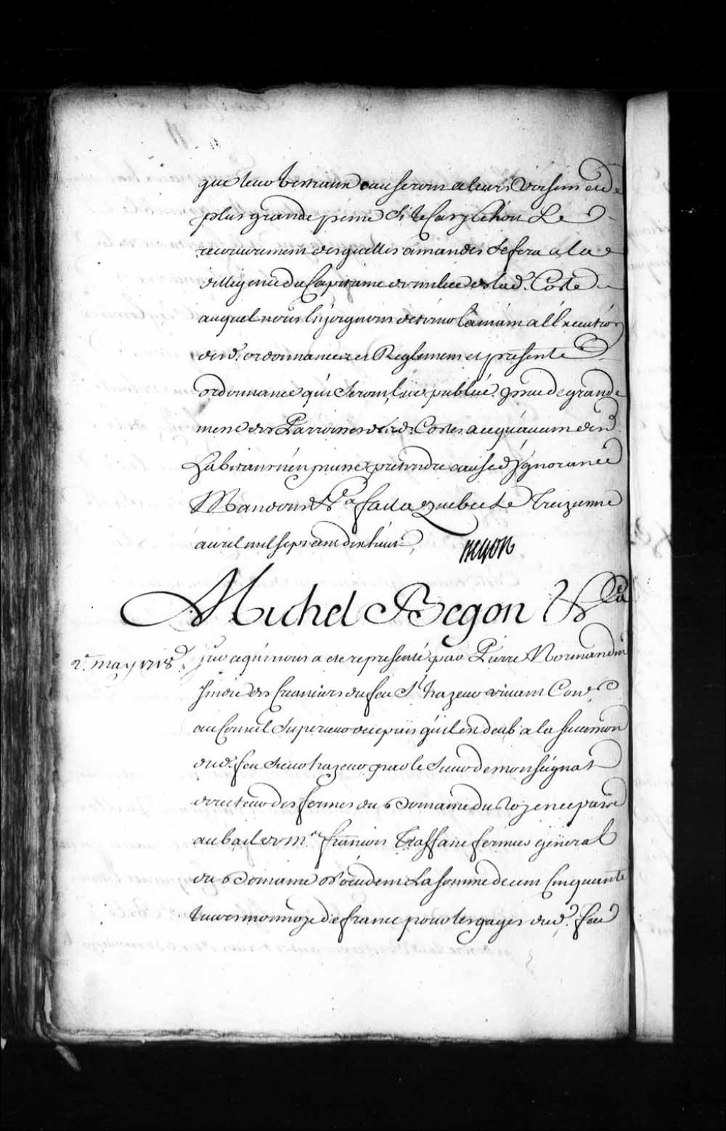 Ordonnance de l'intendant Bégon qui oblige le sieur de Monseignat (Monseignac), directeur des Fermes du Domaine du Roi, de remettre au sieur Petit, trésorier de la Marine, la somme de 150 livres, pour les gages du feu sieur Hazeur comme conseiller au Conseil supérieur de Québec pendant les six premiers mois de 1708, 2 mai 1718, Archives nationales à Québec, Fonds Intendants, (03Q,E1,S1,D6,P1111).