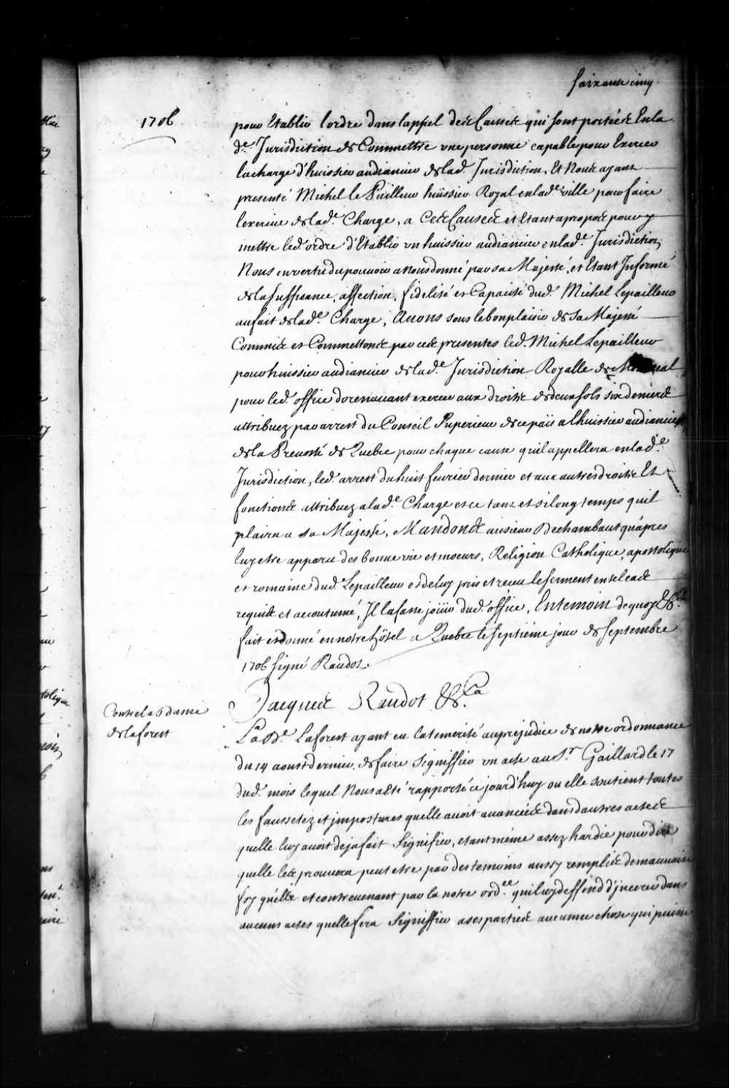 Ordonnance de l'intendant Jacques Raudot qui condamne la dame de LaForest (La Forest) à 500 livres d'amende, payable moitié à l'Hôtel-Dieu de Québec et moitié à l'Hôpital général de Québec, pour avoir fait signifier un acte au sieur Gaillard où elle soutient toutes les faussetés et impostures qu'elle avait avancées dans d'autres actes qu'elle lui avait déjà fait signifier, 9 septembre 1706, Archives nationales à Québec, Fonds Intendants, (03Q,E1,S1,D1,P142).