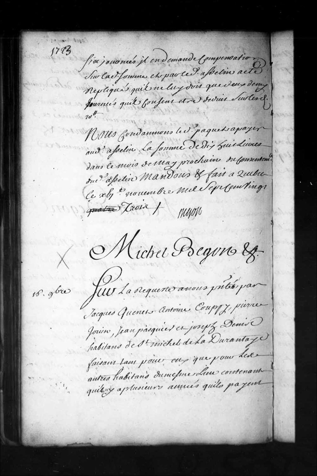 Ordonnance de l'intendant Bégon qui condamne le sieur Gaschet (Gachet), fondé de procuration du sieur de la Durantaye et de la veuve Cadran (Cadrin, Cadron), absents de ce pays, à faire borner incessamment les terres de Jacques Guénet, Antoine Coupy (Coupil, Goupil), Pierre Jouin (Juin), Jean Pasquier (Paquet) et Joseph Denis, habitants de Saint-Michel de la Durantaye, tant sur le front que sur la profondeur desdites terres, et qui surcis au paiement des rentes d'icelles jusqu'à ce que ledit bornage ait été fait, 16 novembre 1723, Archives nationales à Québec, Fonds Intendants, (03Q,E1,S1,D9,P1563).