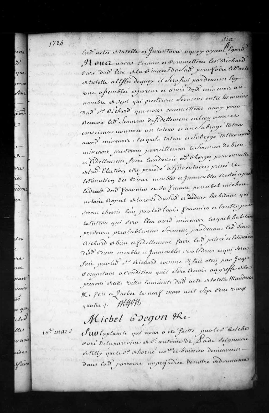 Ordonnance de l'intendant Bégon qui interdit le sieur Dehorné (Dehornay dit Laneuville), notaire et huissier, de la paroisse de Saint-Antoine-de-Tilly, et le condamne à vingt livres d'amende pour le mauvais exemple qu'il a donné en faisant inhumer un de ses enfants dans la paroisse de Sainte-Croix au mépris de l'ordonnance du 30 décembre dernier qui fait défense aux habitants de Bonsecours et de Maranda de reconnaître pour leur curé un autre que celui de la seigneurie de Tilly, 10 mars 1724, Archives nationales à Québec, Fonds Intendants, (03Q,E1,S1,D10,P1577).